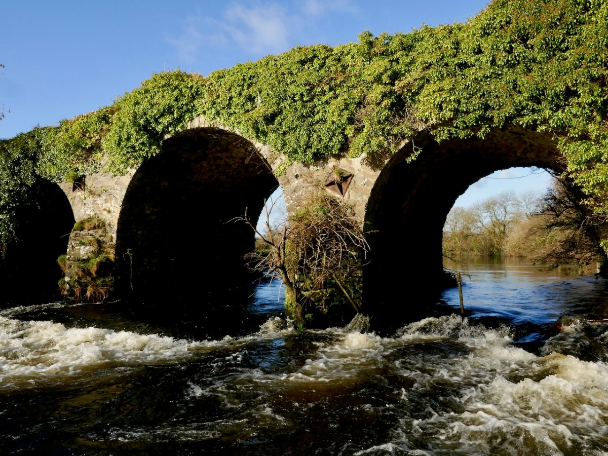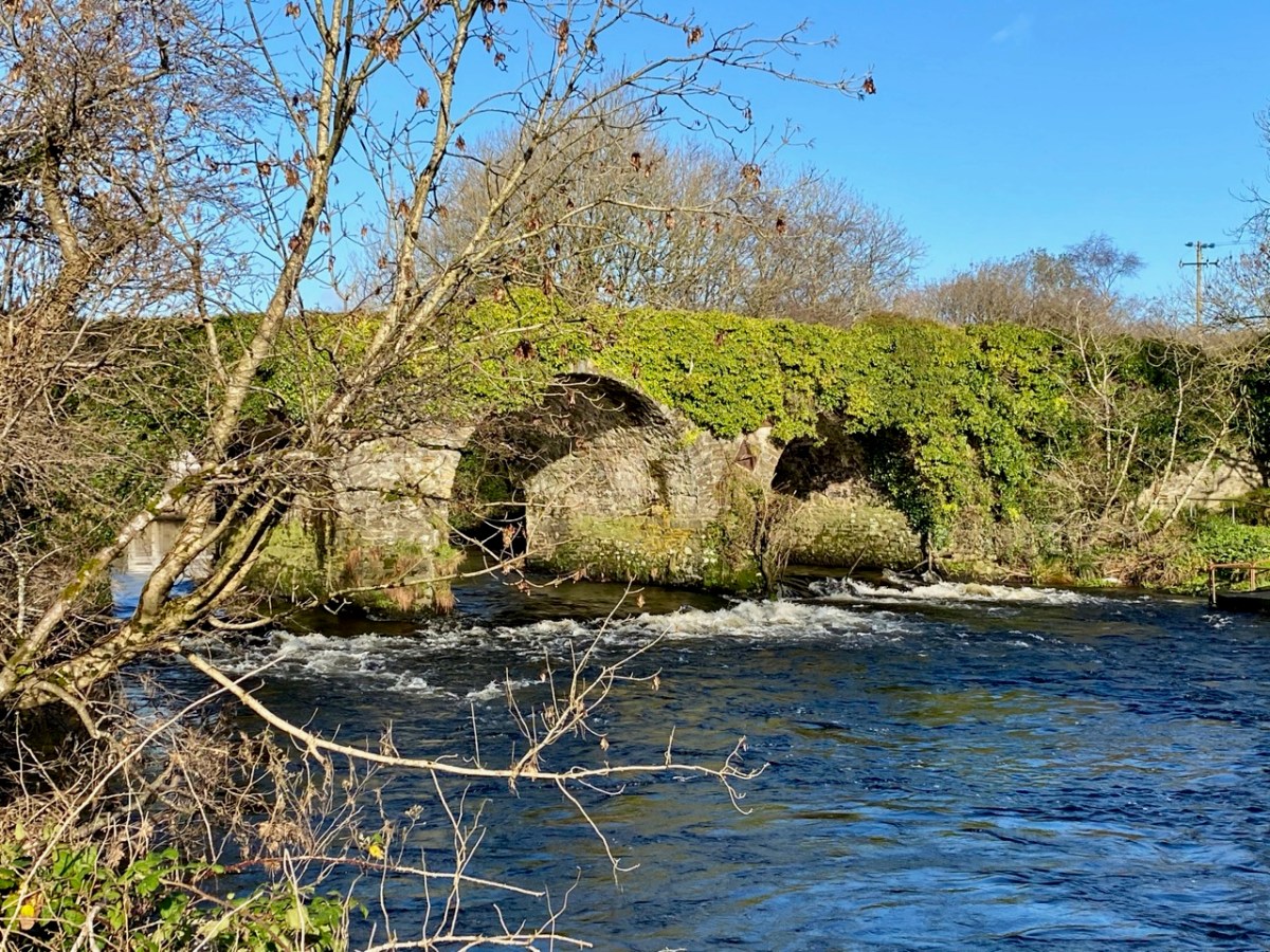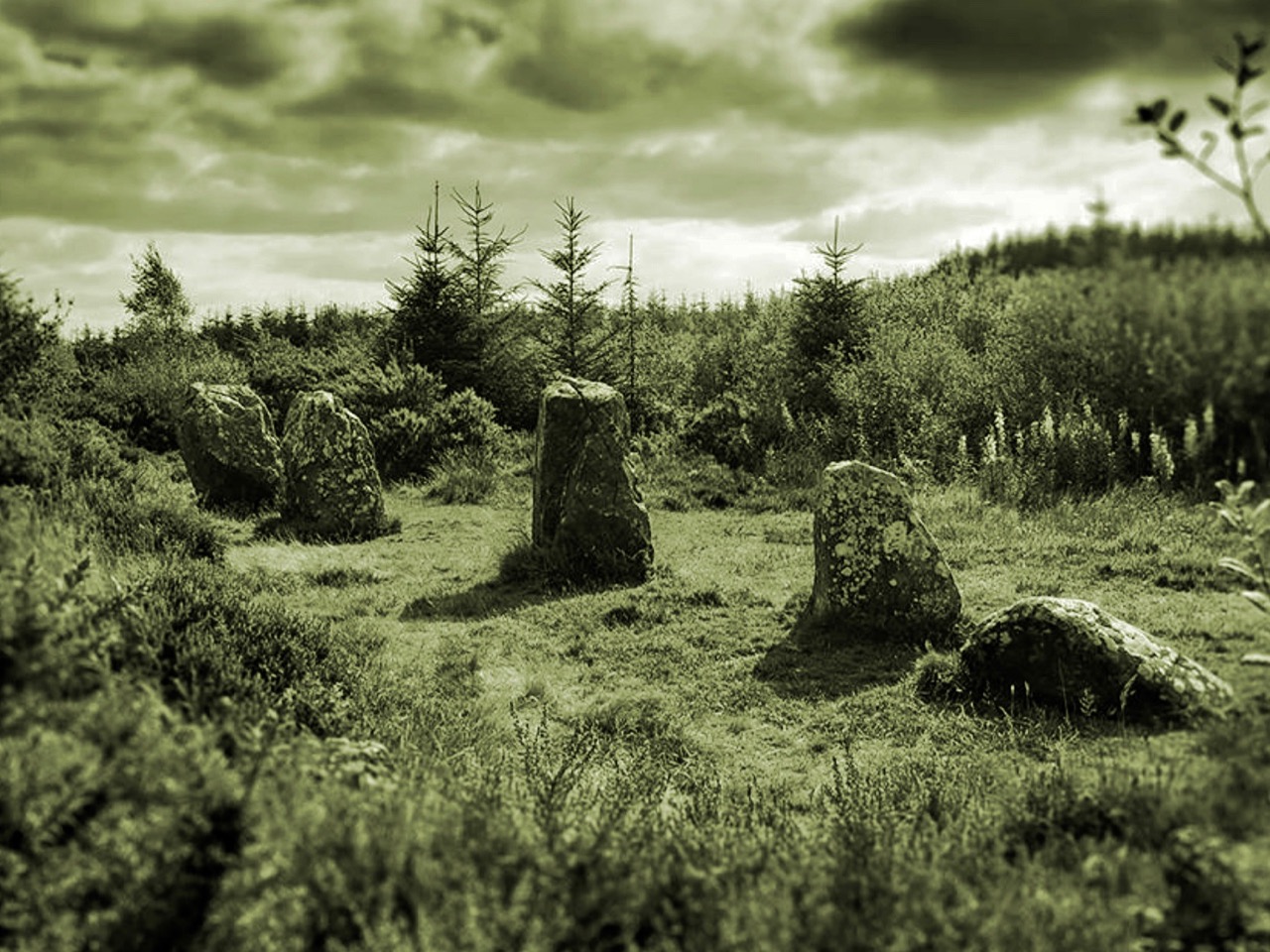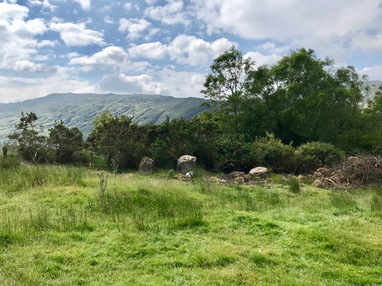 On the lush valley floor are signs of ancient activity and occupation. A stream flows through a meadow dotted with whitethorn trees (upper), while an old stone clapper bridge has been superseded by the modern boreen taking its way up to the Borlin Valley settlements (centre). Lower – a fascinating stone circle and mass rock site is interrupted by the field fence. Here, too, is a bullaun stone and cupmarked rock (below).