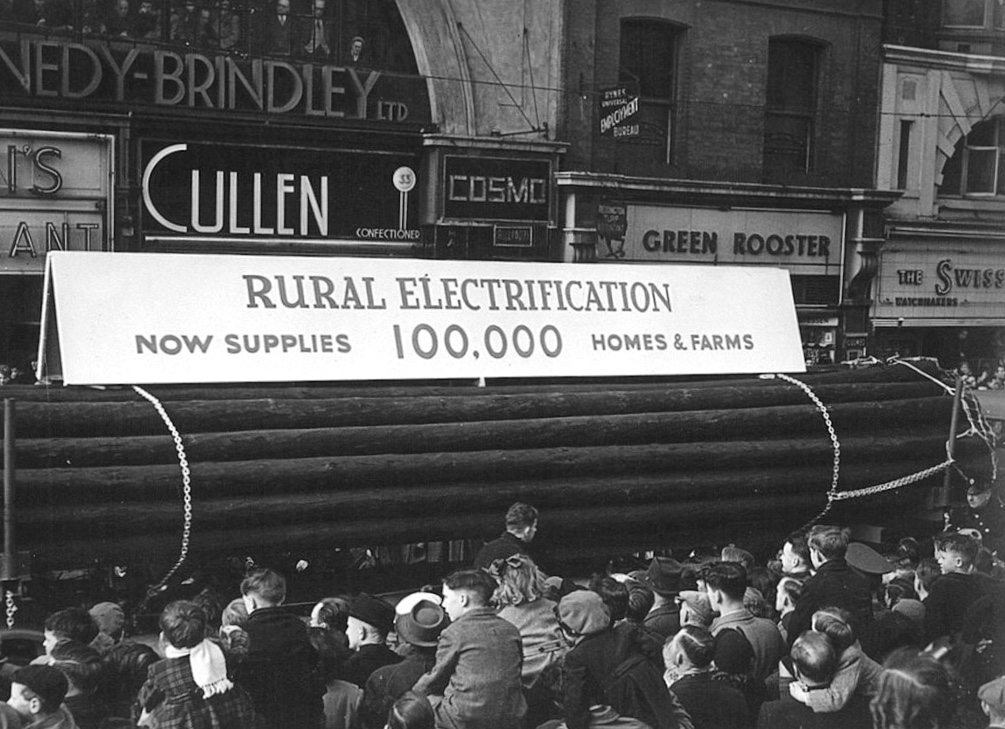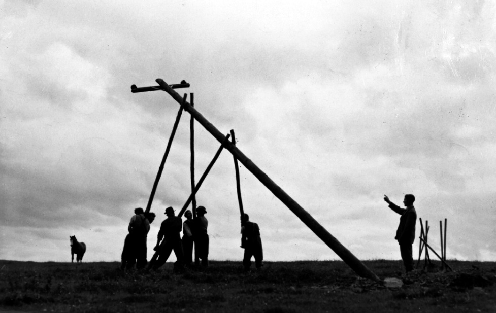 Statistics are remarkable: 2.1 million wooden poles and 150,000 km of overhead line have been used to date, along with 22,000 km of underground supply cable. Due to the Rural Electrification Scheme led by ESB, by the 1960s 80% of rural households had electricity in their homes. Now, most households are connected to the grid, and works are in progress to upgrade the system across the country. In the image below the very first pole is being erected in 1944, while under that is a photo of a PR event ten years later (both are from the ESB Archives).