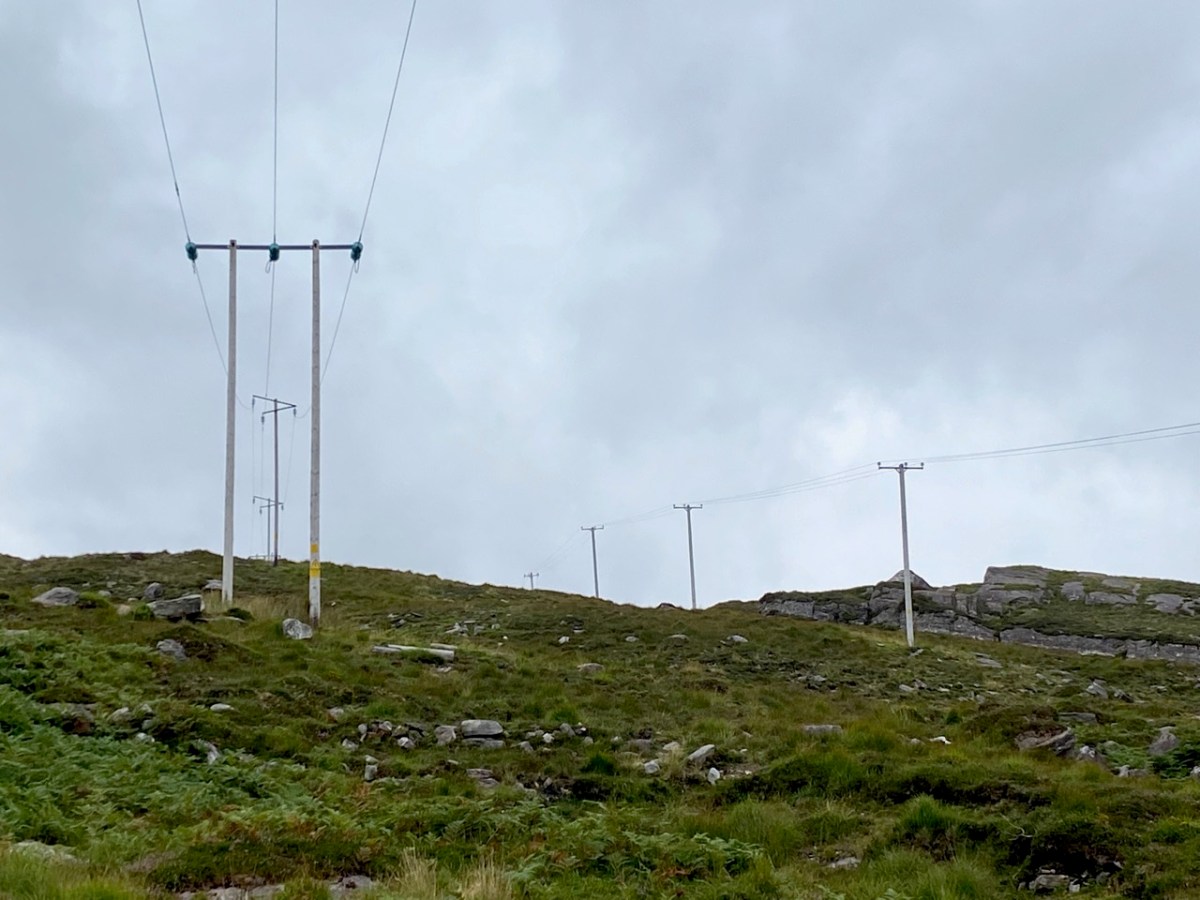 . . . The bigger line on the left is a 38kv line, it goes to Kikgarvan 38kv station and originates at Ballylickey 110kv station. This supplies all of the Beara peninsula with the Kilgarvan line as an alternative “just in case”. It was built in the 1950’s at a guess and would have primarily blasted by gelignite and the poles stood manually.The line on the right is called the Hydro line. It runs over the hill to Slaheny to a small hydro and originated in Bantry 38kv where it picks up another 3 small hydro stations along the way. This Borlin leg was stood in the very early 00’s/ very late 90’s . . .