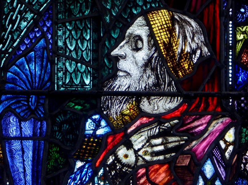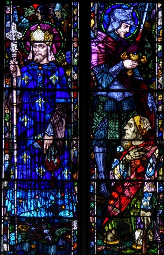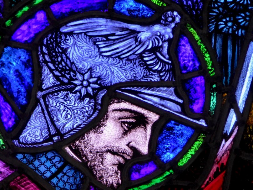 Here is St Martin, depicted in Harry Clarke’s Castletownshend window. Finola tells the full and fascinating story of this wonderful window here. He is depicted as a soldier, and is the patron saint of soldiers. Confusingly, he is also the patron saint of conscientious objectors! In fact, he was the first recorded conscientious objector as he became converted to Christianity while he was serving in the Roman Army. Because of his beliefs he refused to fight but – to prove he was not a coward – he was prepared to go into battle unarmed and stand between the opposing parties in the name of Jesus. Miraculously, on the eve of the battle an armistice was declared. Martin was given a discharge and was able to pursue his calling. Eventually he was made Bishop of Tours and founded his Abbey across the River Loire.