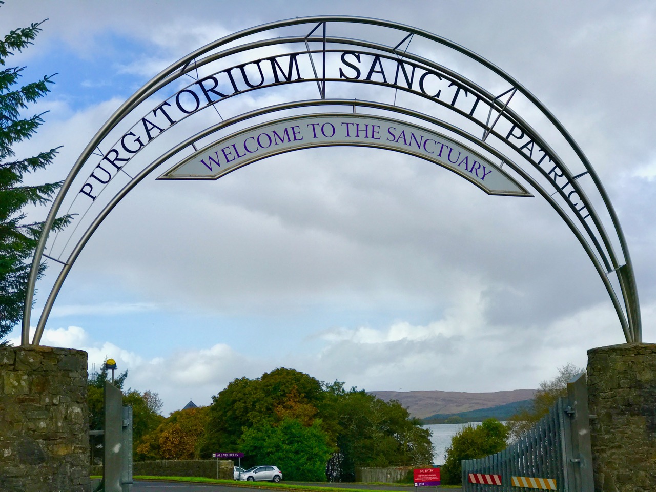 St Patrick’s Purgatory: the name is over the entrance at the reception centre at Ballymacavany, the point of departure for Station Island. The cave which marks the entrance into Purgatory was permanently sealed up in October 1632 when the pilgrimage was suppressed by order of the Privy Council for Ireland; in the same year the Anglican Bishop of Clogher, James Spottiswoode, personally supervised the destruction of everything on the island. Later, in 1704, an Act of Parliament imposed a fine of 10 shillings or a public whipping …as a penalty for going to such places of pilgrimage… The site of the cave entrance lies under the bell tower, seen above. In front are the penitential beds where pilgrims perform rounds to this day. It is thought that these formations are the remains of monks’ cells or ‘beehive huts’.