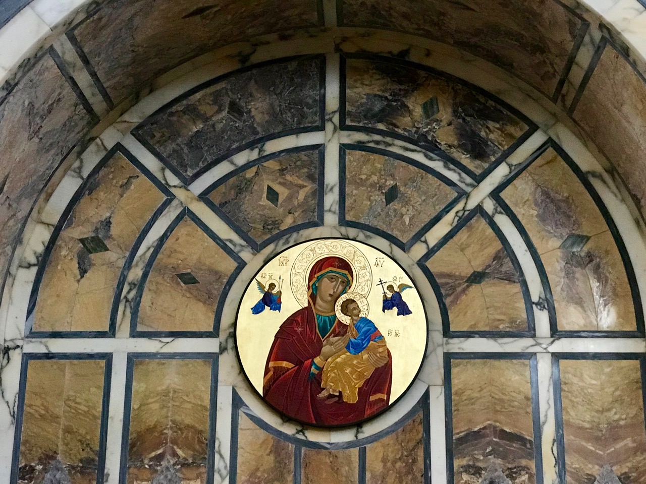 I was excited to be travelling to one of Ireland’s oldest – and most important – pilgrimage sites. Finola studies stained glass windows and their artists, and she knew that some particularly impressive Harry Clarke windows can be seen in the Basilica on Station Island, Lough Derg, in County Donegal. The roof of the Basilica, completed in 1931, towers over the island in the picture above, taken from the quay at Ballymacavany. Finola obtained special permission for us to visit the island to view and photograph the windows, after the main pilgrimage season was over: her account of them will appear in Roaringwater Journal in the near future.