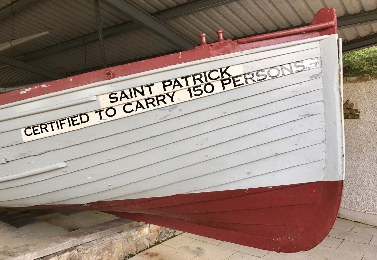 It’s salutary to learn how many people and families we know have taken part in the pilgrimage at Station Island. It’s a particularly austere experience, involving a three day cycle of prayer and liturgies, bare-footed and with very little food or sleep. Finola’s father undertook the pilgrimage in the 1950s: the photograph above was taken at around that time, when pilgrims were ferried over in large open boats once rowed by eight oarsmen and subsequently motorised. One of these historic boats is kept on display at Ballymacavany (below). Nowadays the journey is made in a modern covered launch, as seen in the header photo.