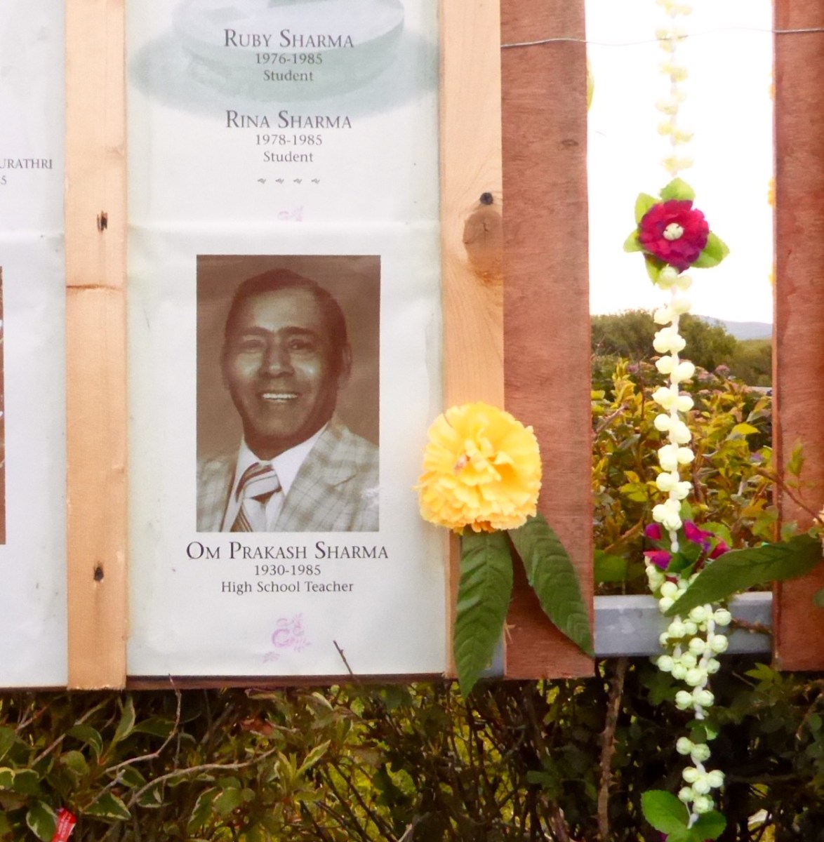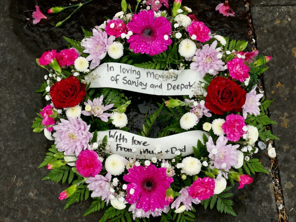 We visited the memorial this week, on Friday the 23rd. The ceremony had taken place, as always, in the morning and the site looked beautiful despite dismal weather. Fresh flowers had been laid, including, most poignantly, for Sanjay and Deepak.