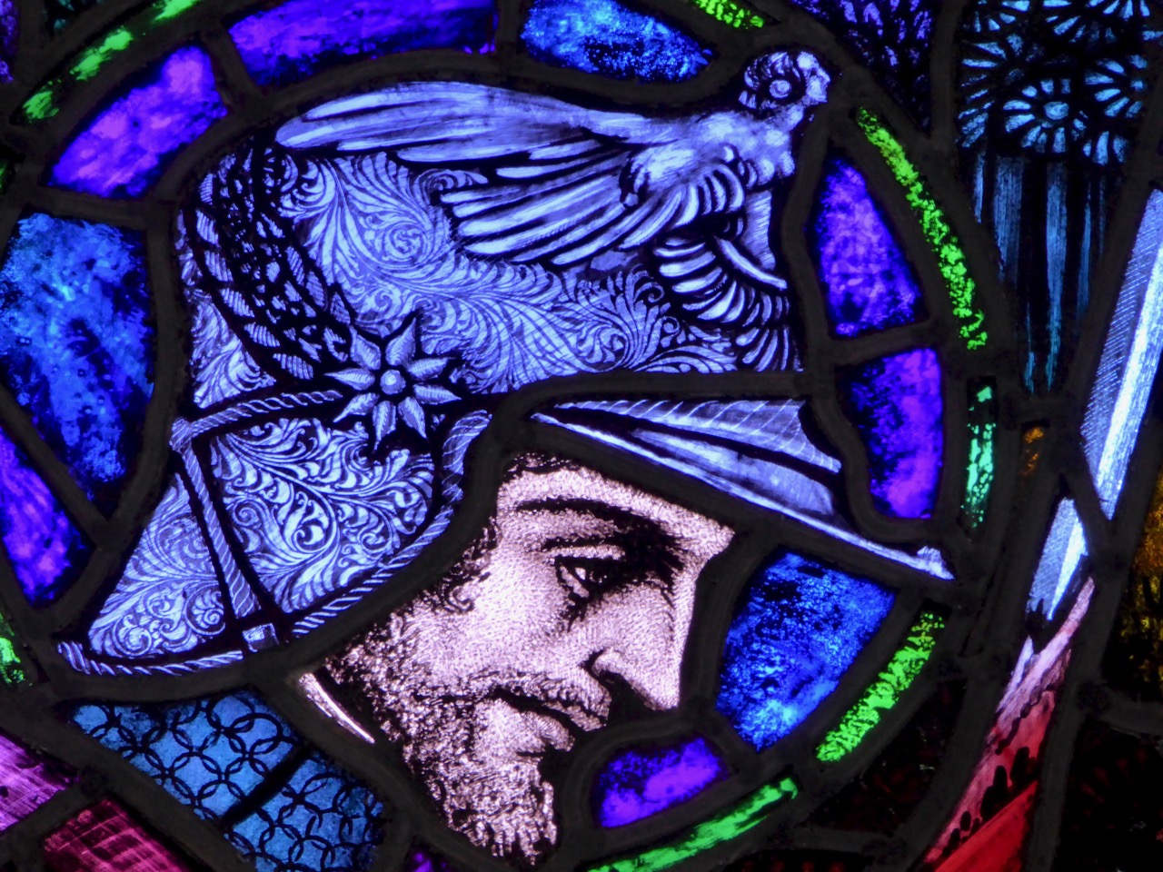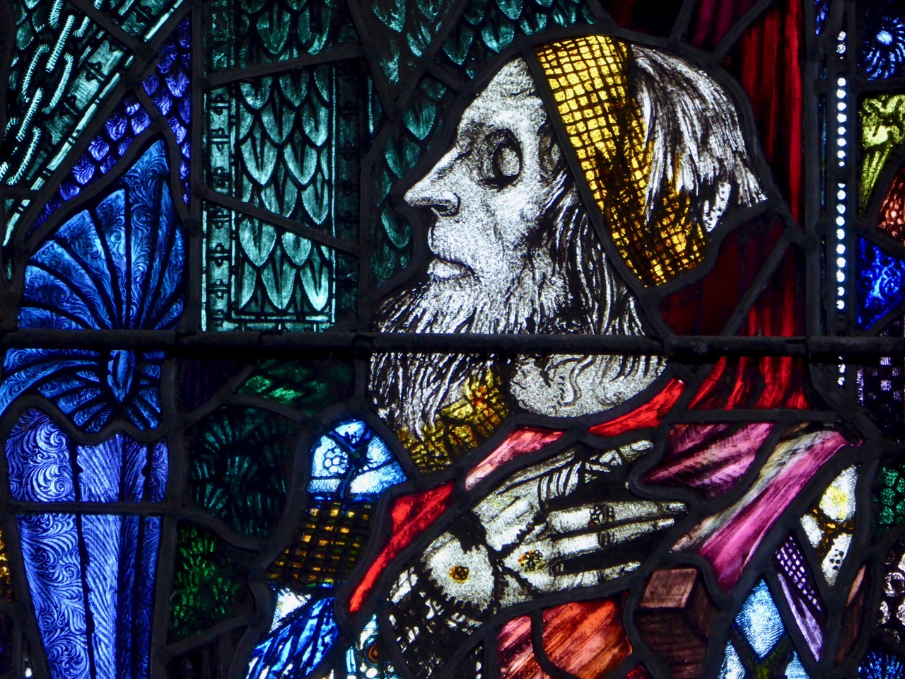 Fachtna was the saint who had founded Rosscarbery and was patron of the diocese of Ross; Harry depicts him holding a church and with his bishop’s crozier. He is gazing contemplatively downwards as if on the Nativity. Notice how the interlacing below him ends in a bird’s head finial.