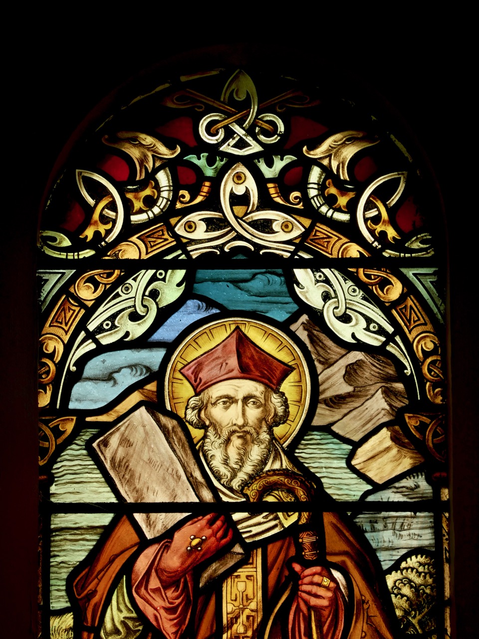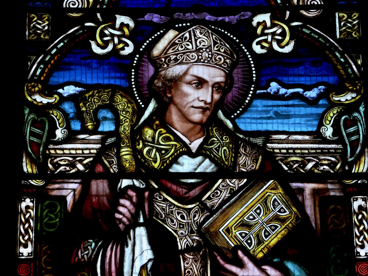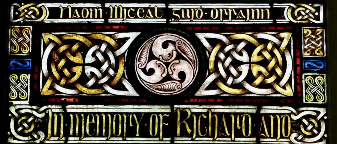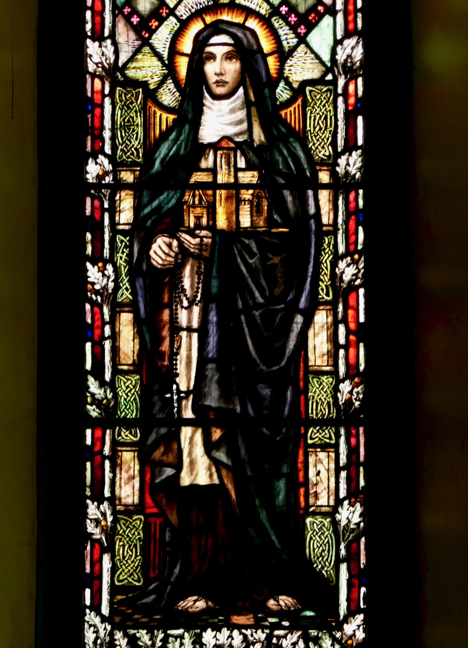 This window by Watsons of Youghal is in St Carthage’s Catholic church in Lismore and is a great example of the Celtic Revival decoration they specialised in. Note the proliferation of oak leaves above her – Kildare is from Cill Dara, meaning Church of the Oakwood, and the oak leaf is one of her attributes, along with the lamp and the crozier, also shown
