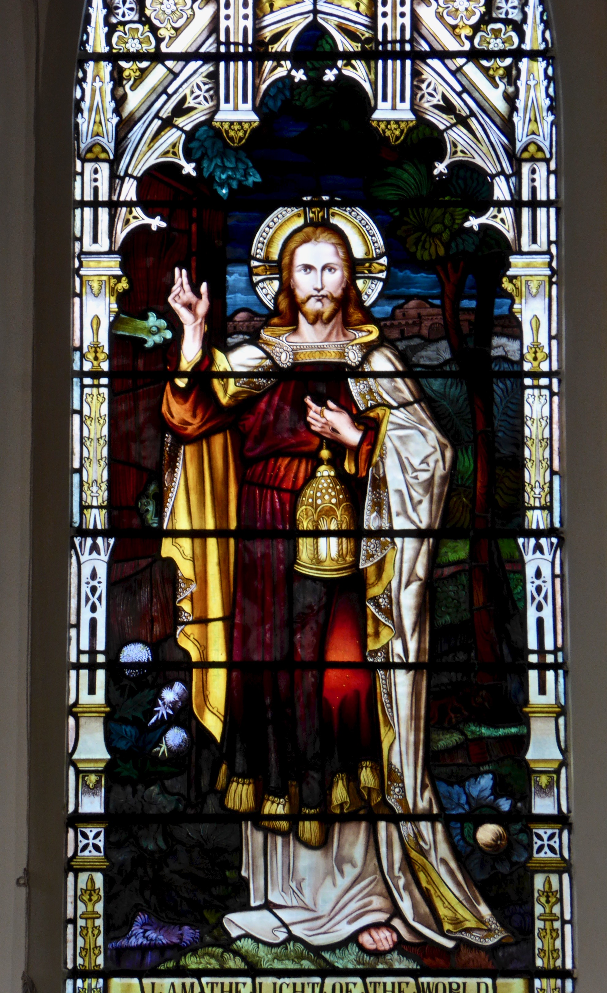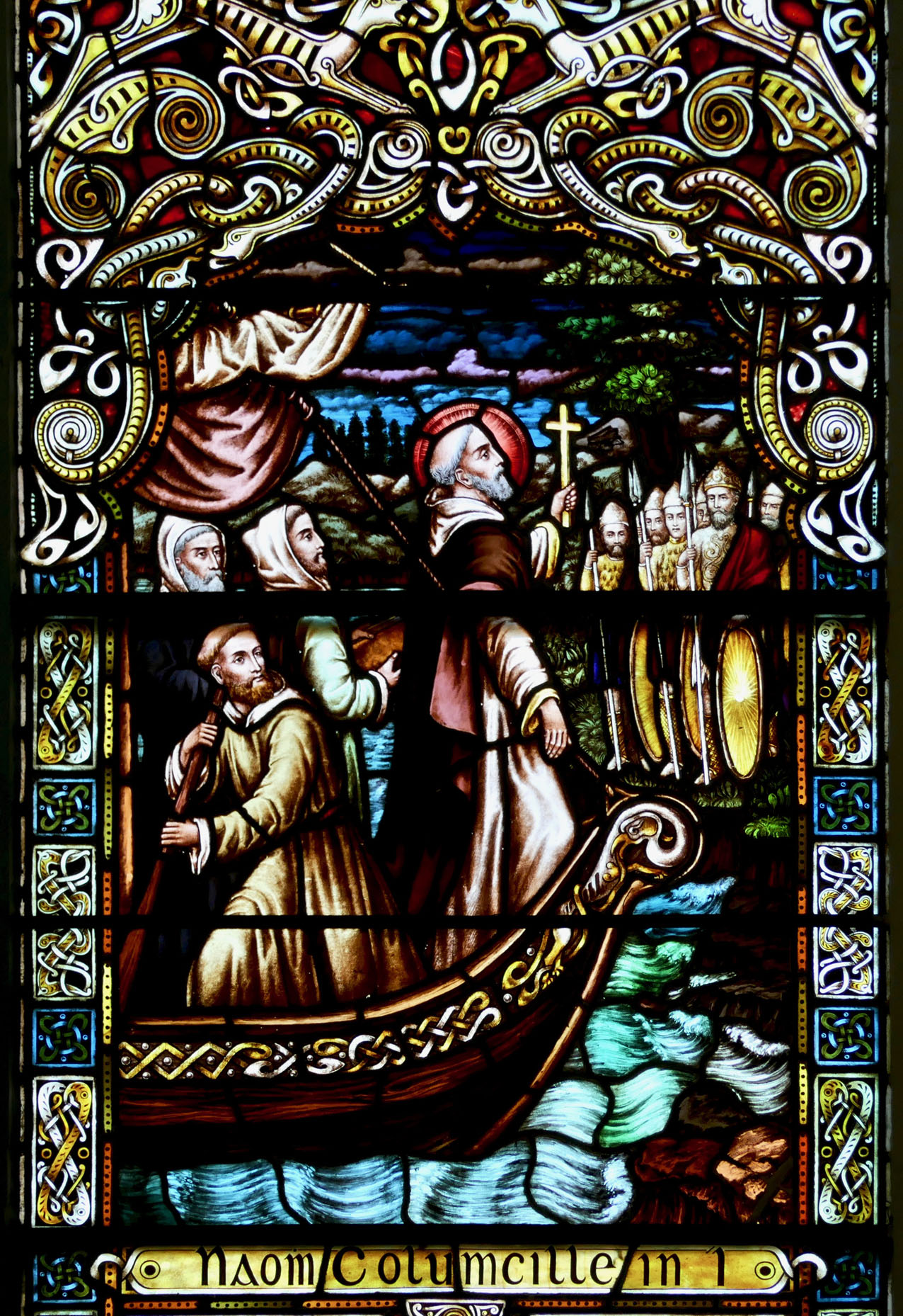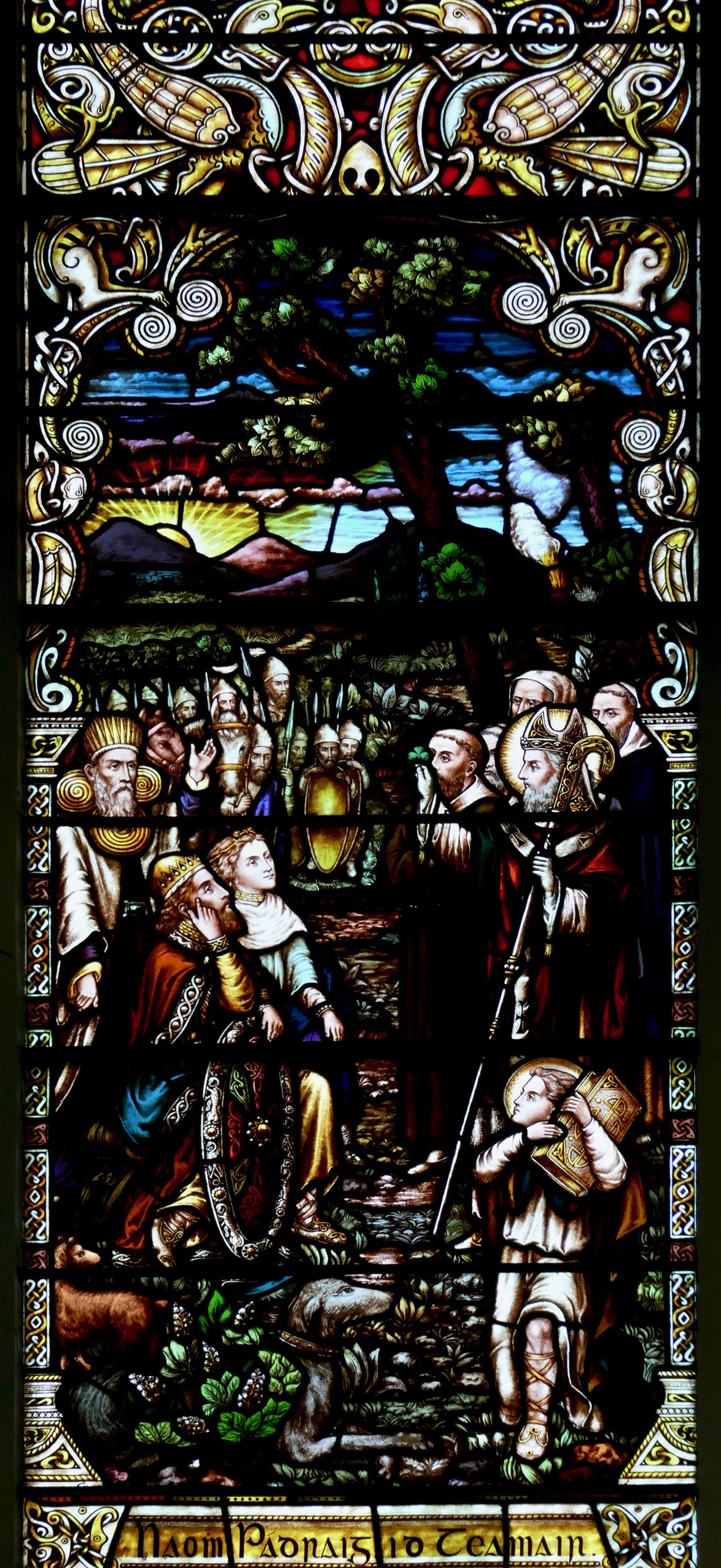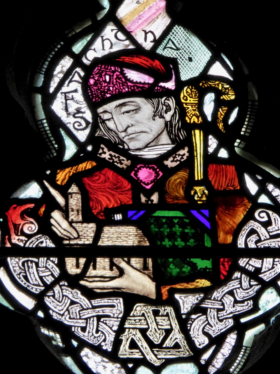 This window by Watsons of Youghal is in St Carthage’s Catholic church in Lismore and is a great example of the Celtic Revival decoration they specialised in. Note the proliferation of oak leaves above her – Kildare is from Cill Dara, meaning Church of the Oakwood, and the oak leaf is one of her attributes, along with the lamp and the crozier, also shown