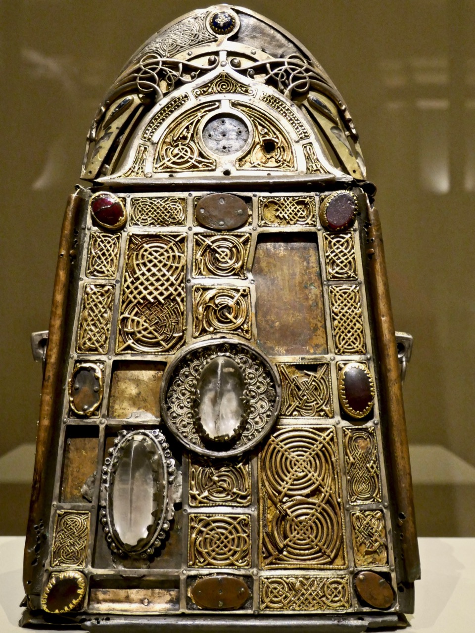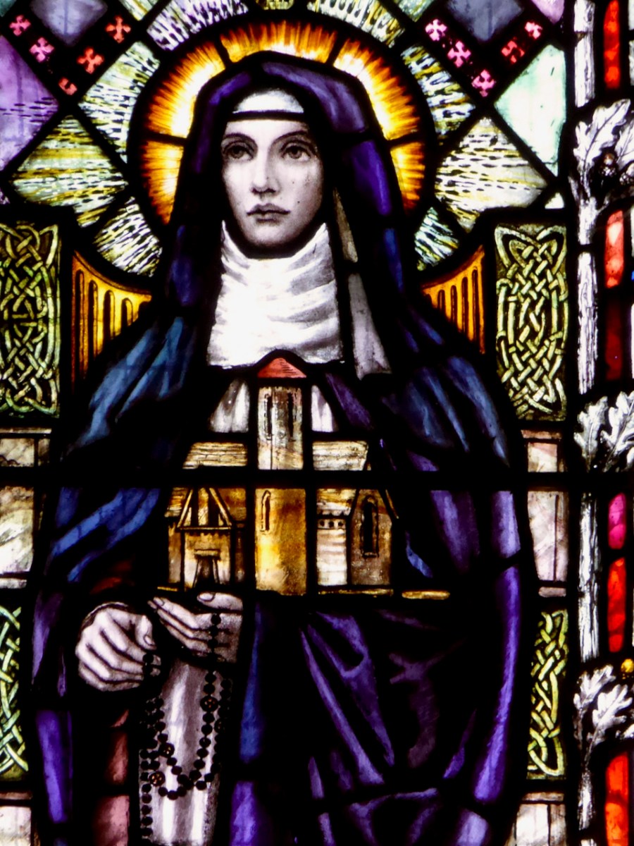 Brigid by Michael Healy, in the stained glass room at the National Gallery, holding her church with the round tower that can still be seen in Kildare.