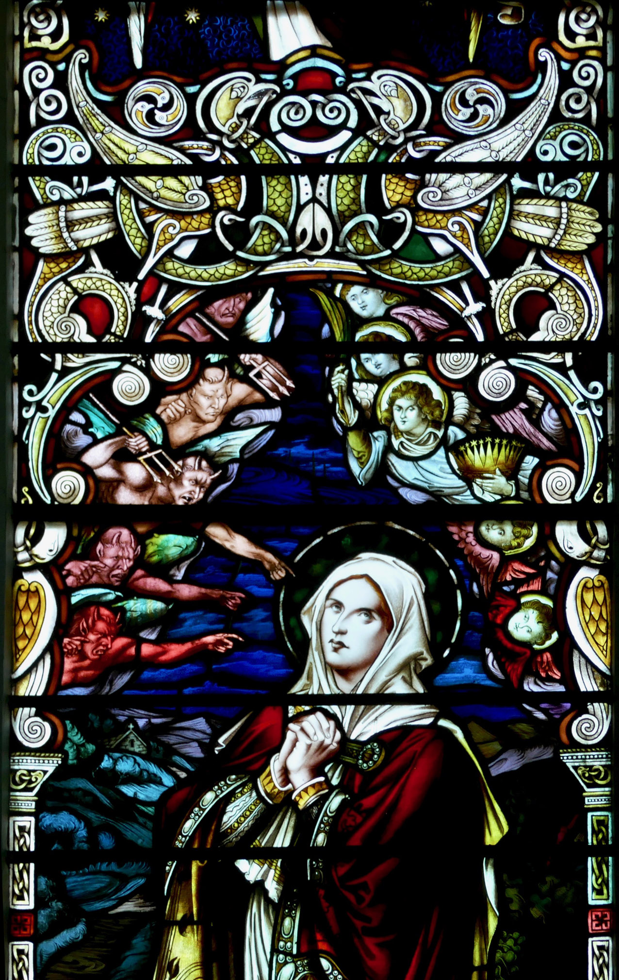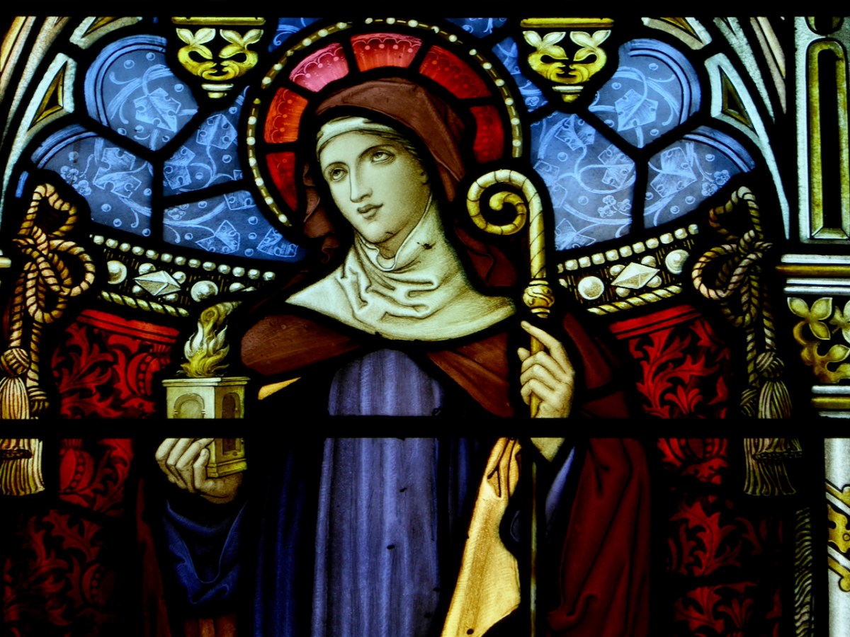Note the lamp, which is one of her attributes, since she is associated with a perpetual fire that miraculously never went out. Given this is Harry Clarke, the lamp looks suspiciously like something from the Arabian Nights.