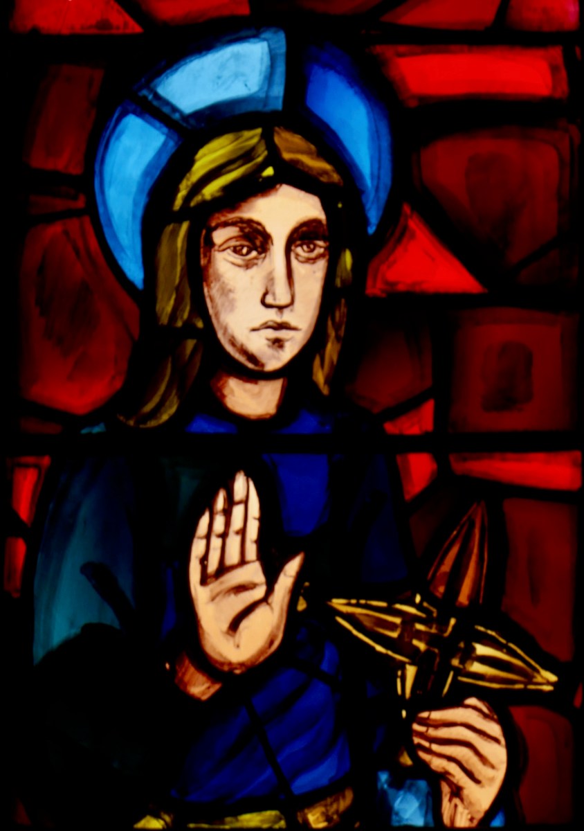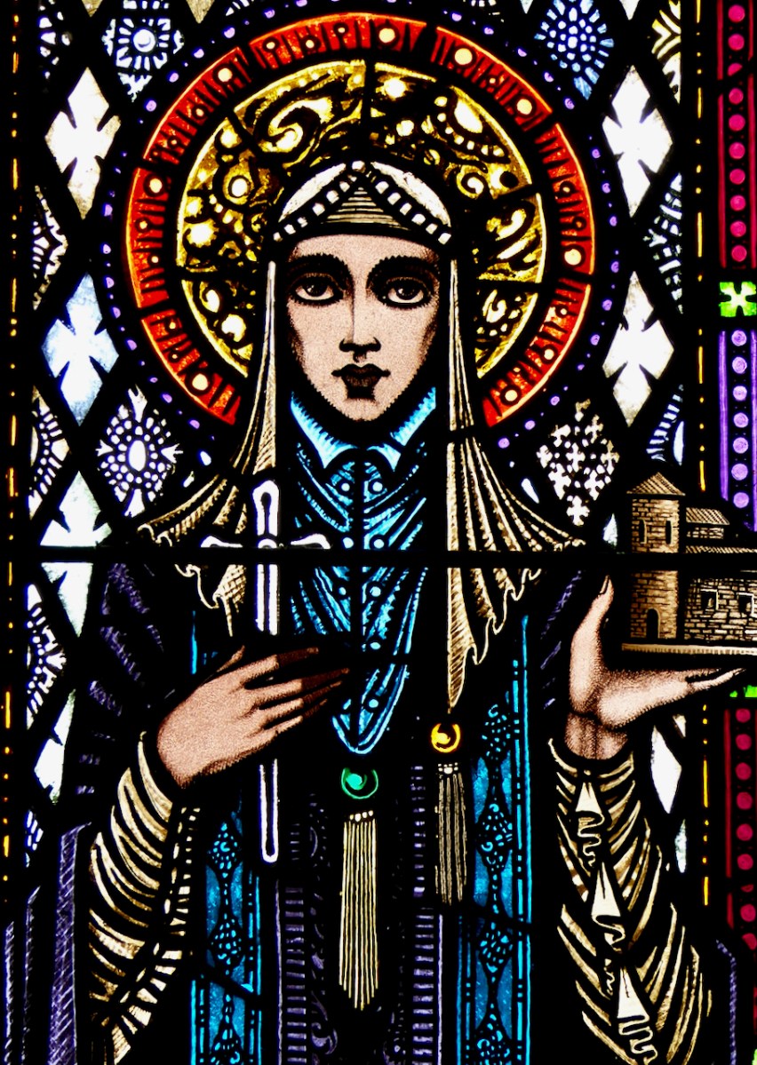 This window is in the Church of the Most Holy Rosary at Kilcoe, near us in West Cork. It’s a bit of a mixed metaphor – we see her holding her church, which is clearly based on the 12th century Cormac’s Chapel at Cashel, and surrounded by her oak leaves. However, she is also holding a set of rosary beads, something that doesn’t appear in Catholic imagery before the 13th century. It’s beautifully executed, though, by Catherine O’Brien of An Túr Gloine.