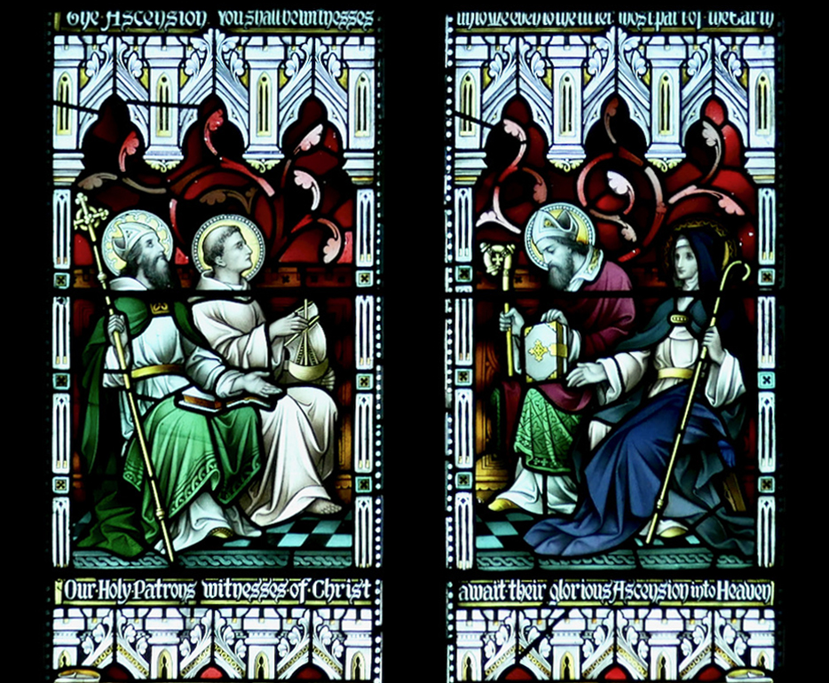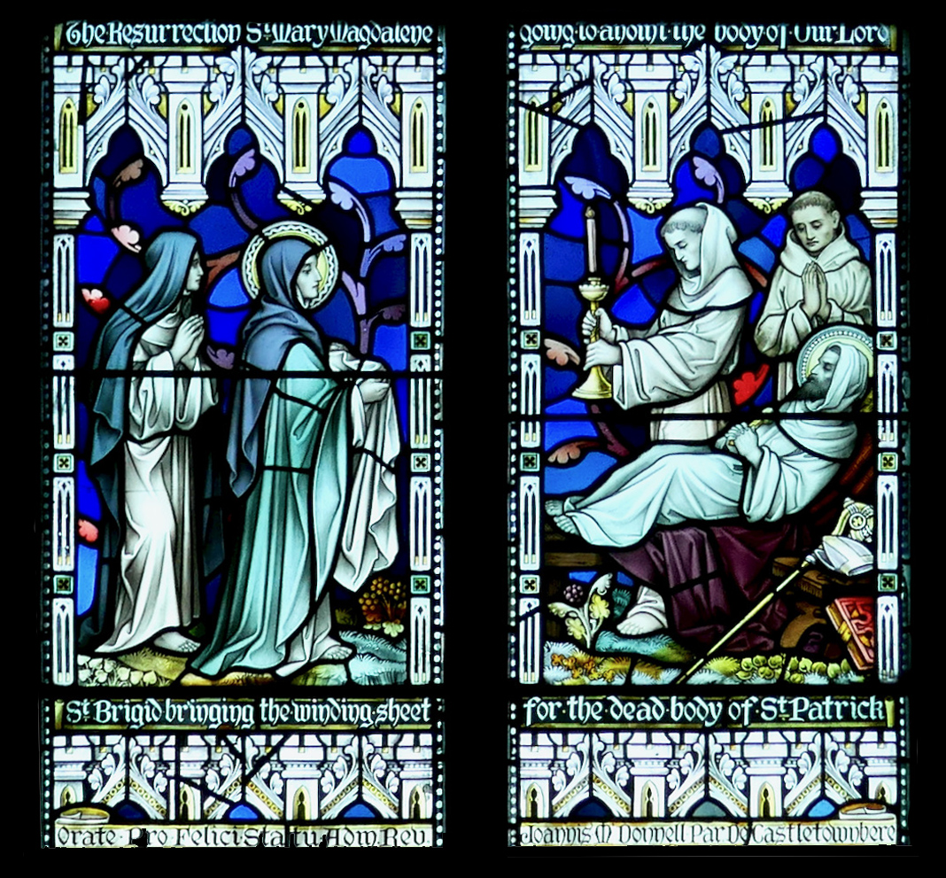 In this window, Brigid brings the winding sheet for the dead St Patrick, a story that does nor feature in either of the Lives I am using here. This is the lower section of a paired window in Killarney Cathedral, part of a series that draws parallels between the Life of Christ and the Lives of Irish Saints. In this case, Brigid is being compared to Mary Magdalene anointing the body of Christ