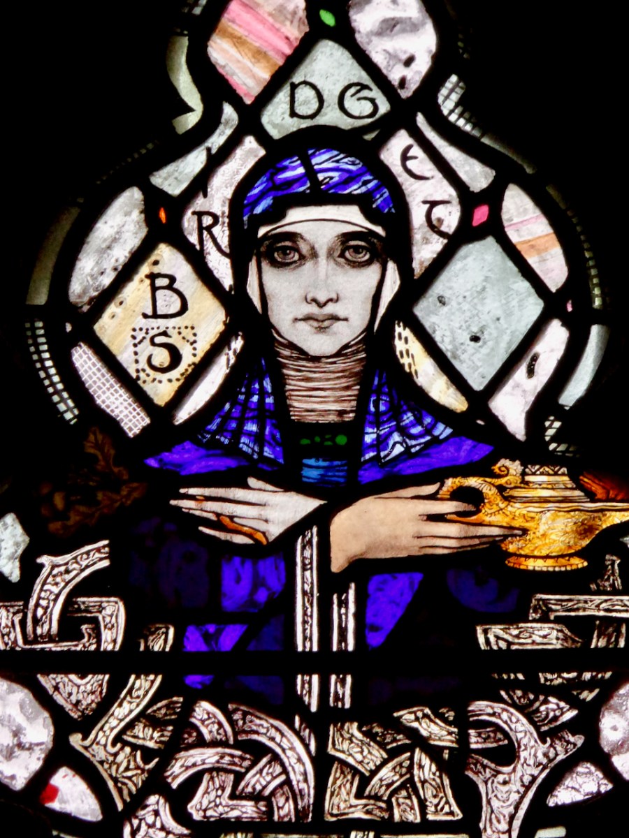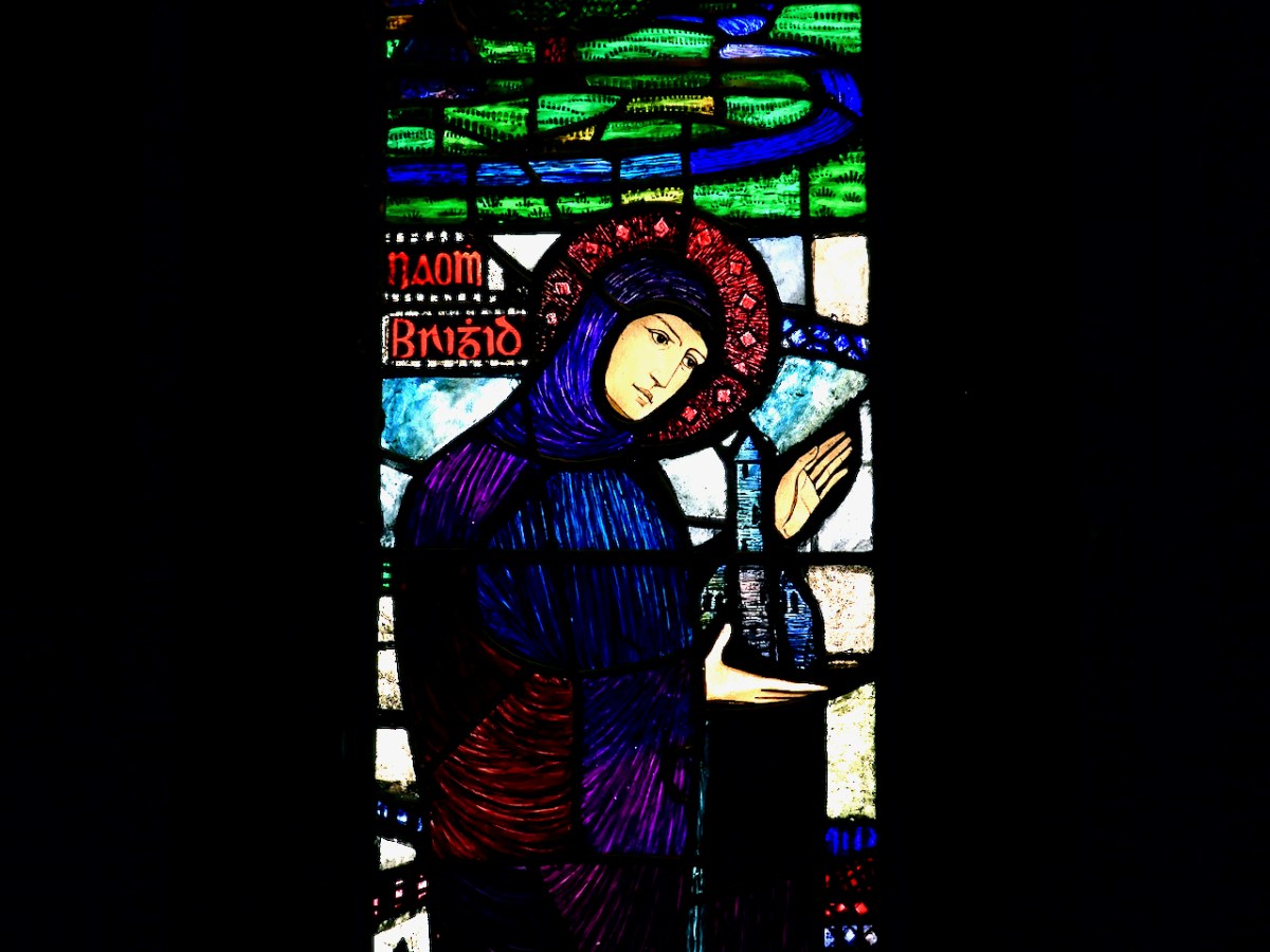 This image of a young Brigid is by Evie Hone and is in Blackrock, Co Dublin. Evie Hone’s windows are pared-to-the-bone, deeply spiritual depictions inspired often by ancient Irish carvings.