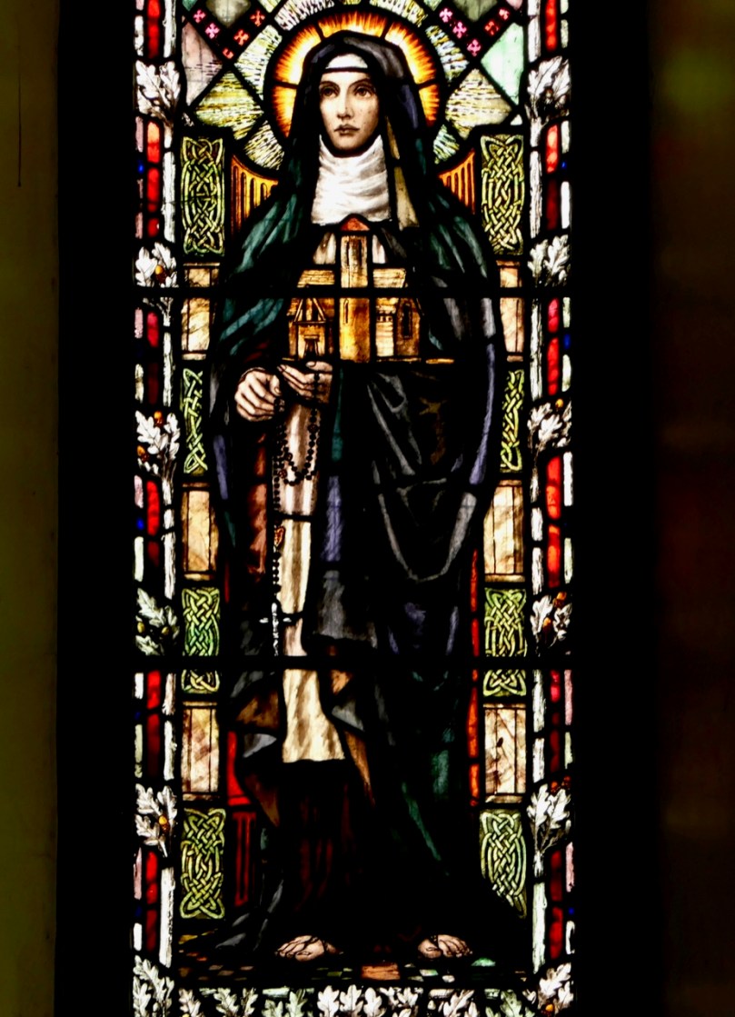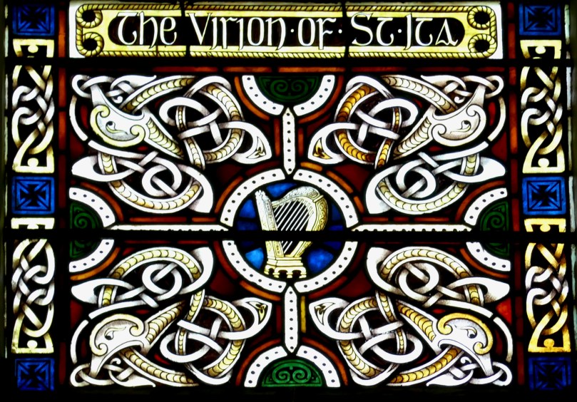 I included a detail from the Vision of St Ita window in Part 1, but it’s worth having a look at more of that window. The end of the nineteenth century saw the publication of many texts related to Irish saints – translations from Irish by such scholars as Whitley Stokes (see my post on The White Hound of Brigown) and Canon John O’Hanlon – and these became the religious equivalent of the stories of Finn McCool, Cuchulainn and the great Irish mythology cycles as written by Standish O’Grady and others at the time. St Ita was the foremost female saint of Ireland after St Brigid, and she is traditionally thought to have come from Waterford. She was given to visions and raptures and this is what is depicted here. And just look at those wonderful birds in the canopy above her head.