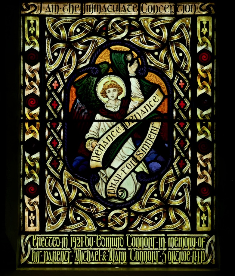 Next we will stop by St Ita’s church in Gortroe, near Youghal. Here you will find one of Watson’s Revivalist windows dedicated to that same Blessed Thaddeus McCarthy (below) about whom Fr Hurley wrote in the Journal of the Cork Historical and Archaeological Society and whose travails I described in my Post Thaddeus McCarthy, The Bishop Who Never Was. In the sanctuary is a three light window, the Sacred Heart flanked by Thaddeus and St Ita, while a Lourdes window occupies the south wall (a detail from that window is my lead image in this post).