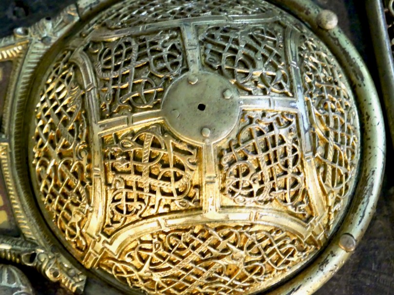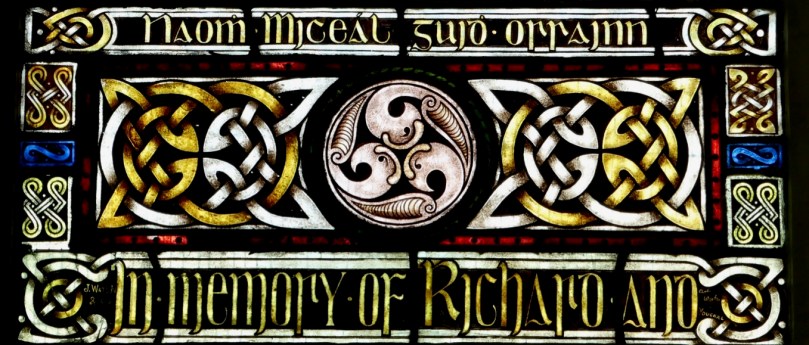Interlacing is the preferred word for the complex looping and braiding of ribbons, which twist in and out and around each other and often end in the head of a fantastical animal. Artists studied the Book of Kells and other illuminated manuscripts, copied the elaborate decorations and eventually figured out their own designs. Just walk through any older cemetery in Ireland to see the craftsmanship with which many crosses were carved with interlace motifs. So it was with Watsons: they became expert at fitting and filling spaces in a window with Revivalist designs.