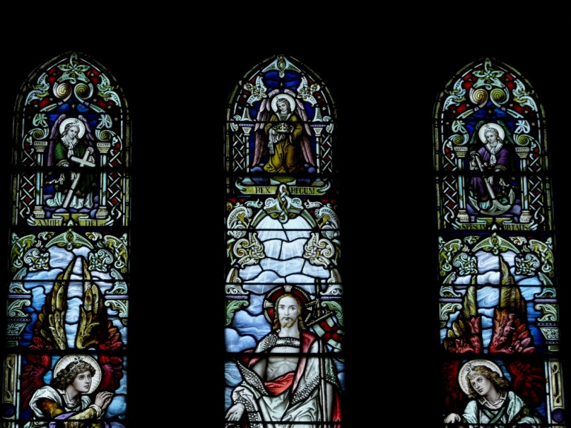 The Rose Window has a panoply of Irish Saints (including Saint Otteran, Patron Saint of Atheists!) each one occupying one of the rays of the rose with cherubs encased in interlace. As they say in property ads – must be seen to be appreciated.