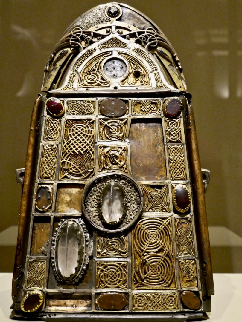 This demonstrates the popularity of these hagiographies with Irish Catholics and their clergy at the time – the artists responsible for these windows had to make sure they were well read on the lives of Irish saints. Both the Columcille window (above) and the Patrick window (below) exuberantly display their artist’s knowledge of the lives and deeds of these saints as well as their immersion in all the tropes of Celtic Revival imagery (wolfhound, anyone?).