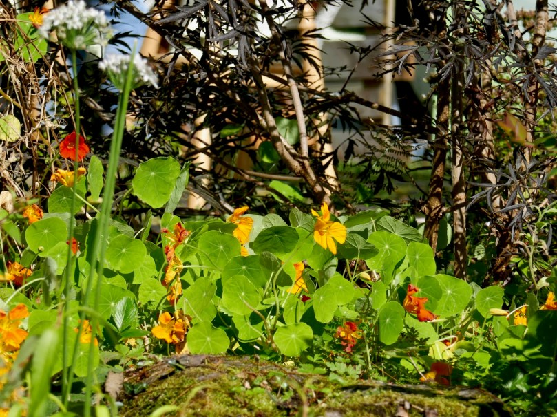 From the top: Nasturtiums and a miniature Fuchsia – very pretty but also edible