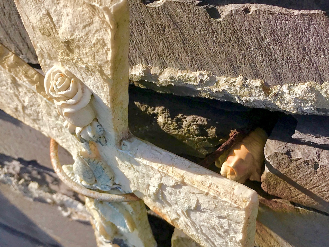 The gable shrine seen with the bridge from Portmagee to Valentia Island in the background. In front of the shrine are (probably much later) grave markers. It was common practice to put burials close to anciently sacred sites: in fact, up to the 20th century Illaunloughan was used as a cillín for the burial of unbaptised infants and as a graveyard by local people.