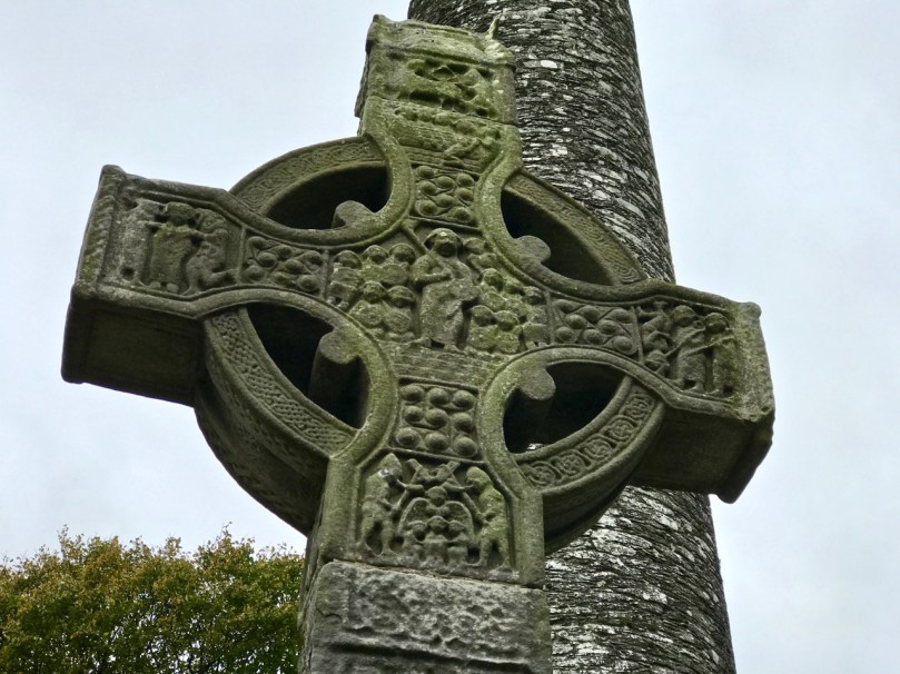 Muiredach mac Domhnaill, who died in 923, was an Abbot at Monasterboice. He is  credited with commissioning the great cross, shown above. It’s not quite the tallest high cross in Ireland, but it’s said to be the finest, probably because of its stature and remarkable state of preservation. The carved panels are all legible, and the biblical stories illustrated have all been identified. An inscription on the lower section of the cross shaft states: OR DU MUIREDACH LASNDERNAD IN CHROS – A prayer for Muiredach under whose auspices this cross was made. Confusingly there was also a king, Muiredach mac Cathail, who owned the lands on which the monastery was built. He died around 867, so it is possible that the cross was commissioned by him, or was made in commemoration of him, rather than by the Abbot.