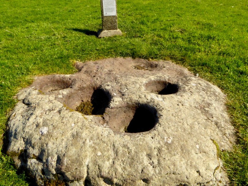 This rock outcrop – known locally as The Rolls of Butter – is large (I’m there to give it scale!) with seven scooped-out bullaun like basins and a somewhat phallic central upright stone. The basins each contain a large, smoothed pebble. Some folk traditions in Ireland identify such pebbles as ‘cursing stones’: “. . . if you wanted to put a curse on someone, you turned the stones anti-clockwise in the morning . . . ” However, the curse had to be ‘just’ otherwise it came back to curse you in the evening! The illustration below – of ‘cursing stones’ at Killinagh, Co Cavan was made by antiquarian W F Wakeman in 1875. He also noted the similar local folk traditions of these examples.