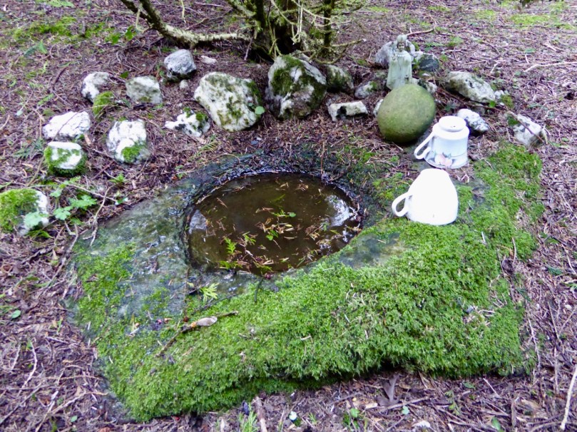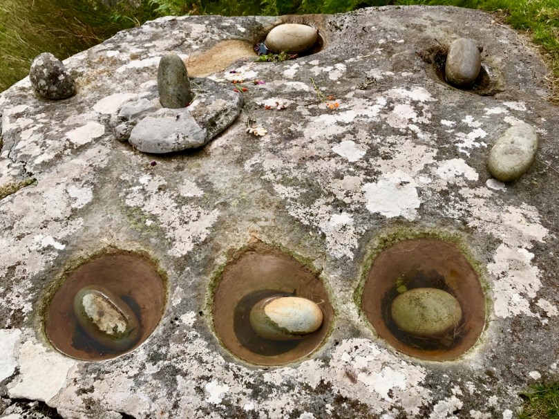 The Maulinward example on the header picture shows how the tradition of making offerings at some of these locations continues to this day. At other sites, such as the one below, the hollowed-out stone filled with rainwater takes on the properties of a holy well, and is visited for cures or simply good fortune.