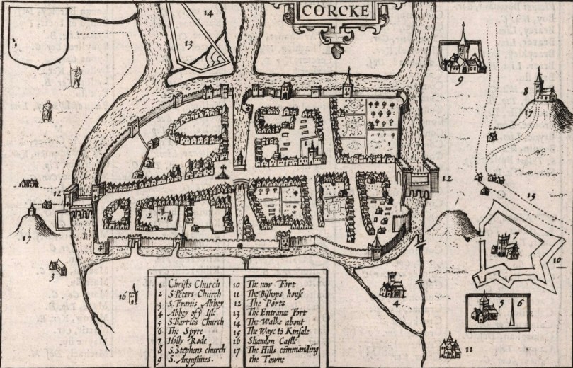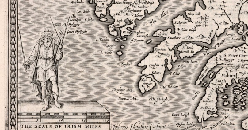 John Speed was one of the greatest of Britain’s map-makers, but it is unclear how much actual original cartography he did. Much of the information in his maps appears to be based on Mercator’s maps, which we featured in Mapping West Cork, Part 1. What does appear to be original, as there are no previous records of them, are the city maps, so we can be reasonably sure that these were done from his own calculations – laid out by paces rather than by measuring implements.