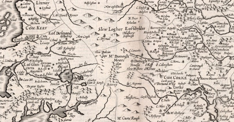Besides the O’Mahonys, the O’Driscolls, the McCarthys, the O’Donovans, Sir Peter Carew occupies a chunk of land. Someday I will write about his claim to that land and the lengths he went to to secure the deeds to it. But perhaps I shouldn’t be too exclusive to West Cork: below is a section of North Cork and part of Kerry in 1612. What can you see?