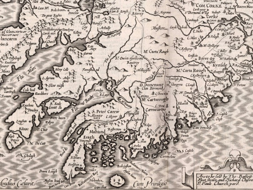 The actual physical depiction of the land is recognisably based on the Mercator map but there is more information now about locations and families. I was delighted to see Rossbrin show up (Roßbrenon) along with Ardintenant (Artenay), since it is this castle that we look across to from our home. Mizen Head and Brow Head are both marked, and the Sheep’s Head is also noted as Moentervary (Muintir Bheara is the Irish designation for that Peninsula).