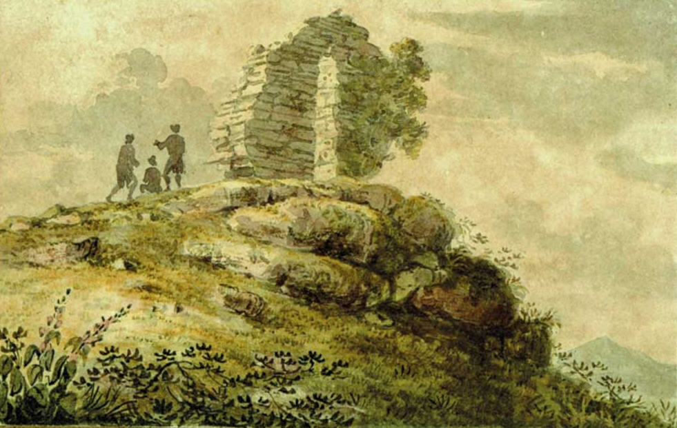 This is the inlet at Castlehaven, looking towards Castletownshend. It’s a peaceful scene. Finola and I were in the village at the weekend, showing groups around the church and the graveyard: it was a West Cork History Festival event. Very recently, I came across a reference to a structure that used to stand looking over this inlet: it was known as Nelson’s Arch. Here’s a watercolour print dating from the early nineteenth century . . .