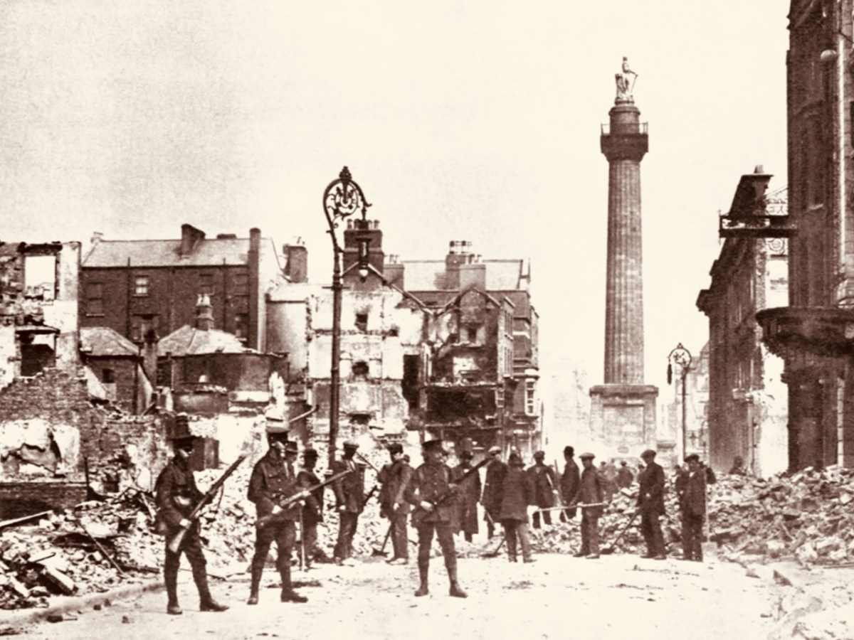 This structure in today’s O’Connell Street was made by Cork sculptor Thomas Kirk. From its opening on 29 October 1809 the 40.9 metre high Pillar was a popular visitor attraction, as it contained a staircase which could be climbed by the public, and which provided a wide view over the city centre. The London column – built from Dartmoor granite – was never provided with a staircase, but it’s a ‘must-see’ tourist destination. It’s actually the only extant monument to Nelson: having survived the rising on Easter Monday, 24 April 1916 – when the nearby General Post Office was reduced to a burnt-out shell, (below) – Dublin’s Pillar succumbed to an attack – probably by dissident volunteers – on 8 March 1966 . . .