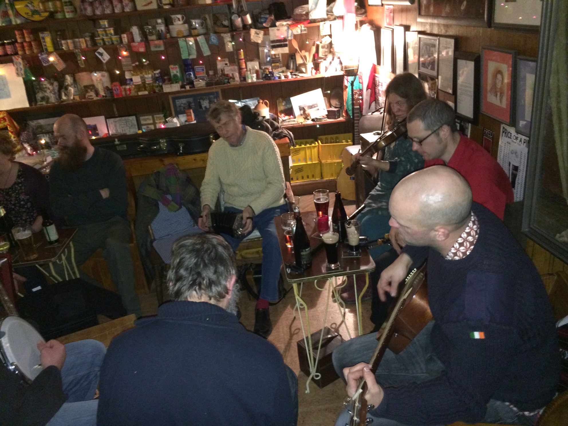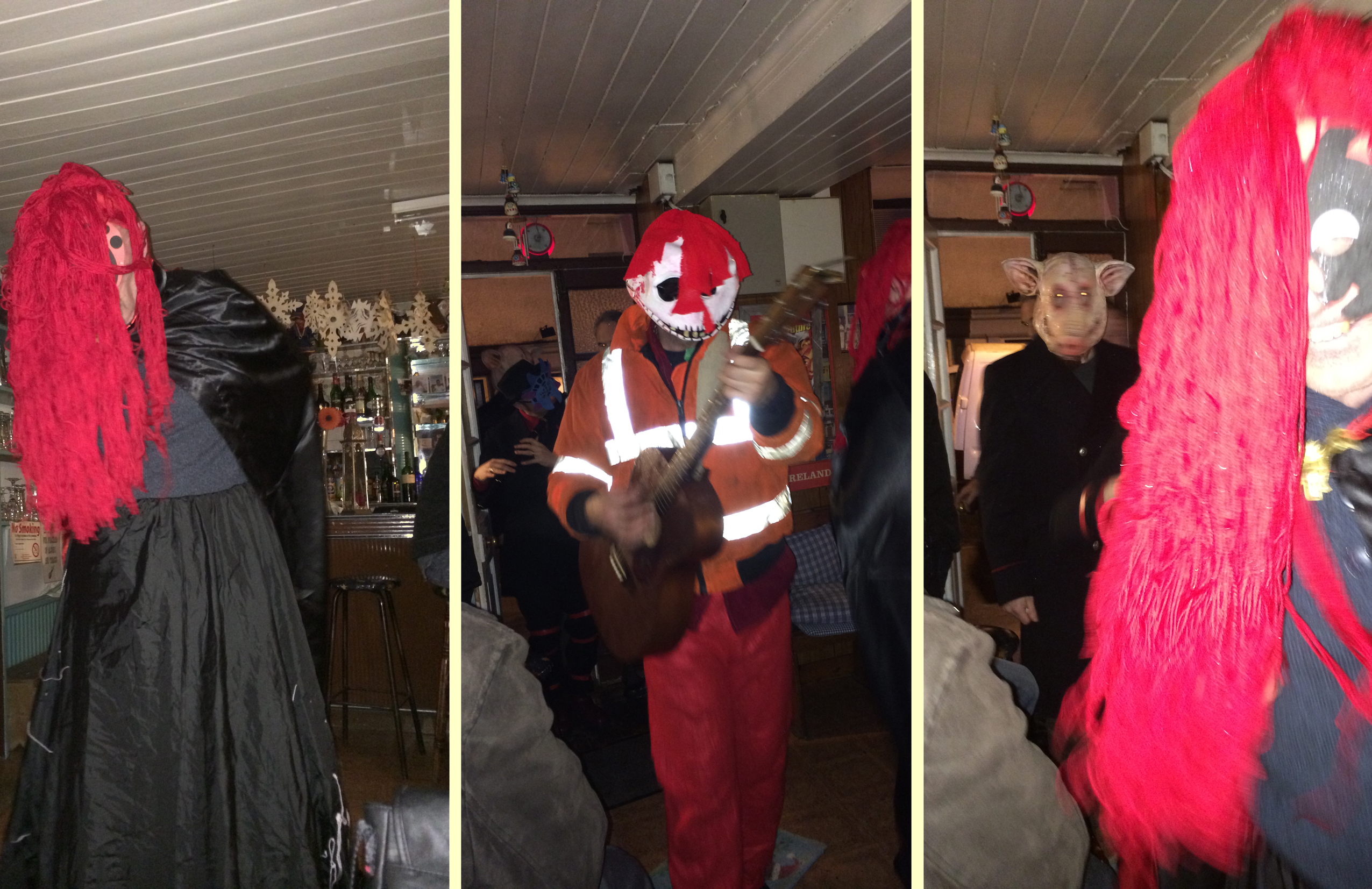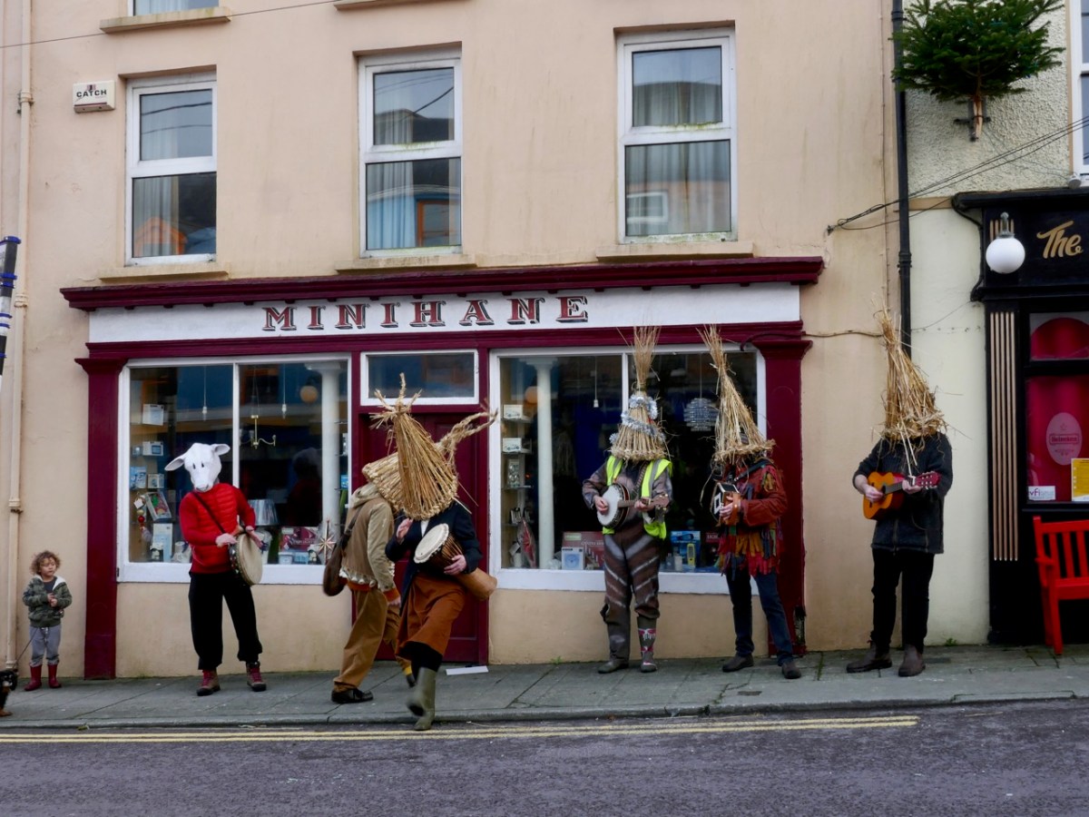 Earlier in the day we had enjoyed an unexpected visit by the Wren Boys to Levis’s pub, where we were involved in an improvised session. Two groups of Wren Boys in fact: the first an adult company with musicians, colourful costumes and bizarre masks, and the second a group of boys dressed in old coats turned inside out, pyjamas and sailor caps, carrying large collecting tins. All were welcomed and the festivities grew merrier as the wind strengthened.