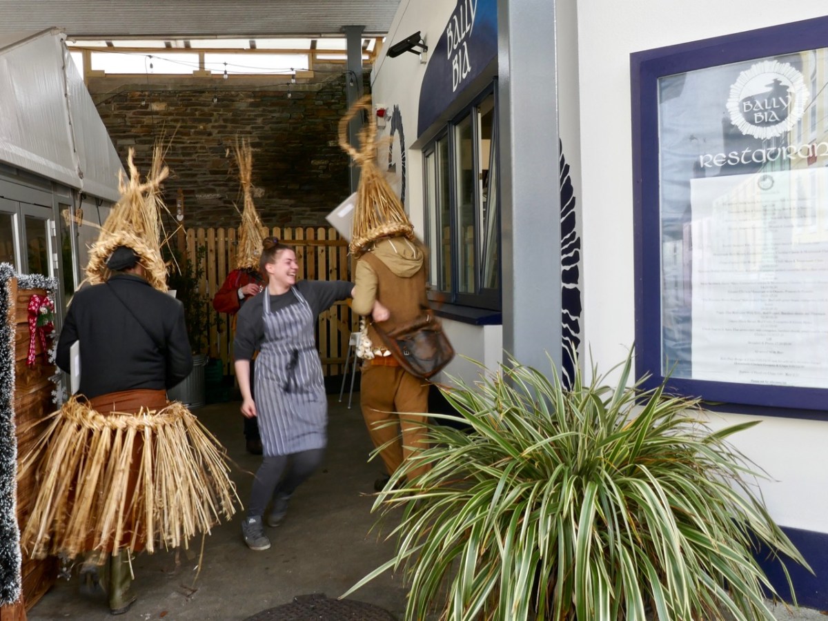 By good fortune there’s ‘Mr O’Leary’ above! He’s the landlord of Levis’ Corner House Bar in Ballydehob: he allowed the Wran workshop to take over his pub yesterday. Basically that involved covering the whole place in straw out of which, magically, appeared lots of wonderfully crafted Wran masks. Joe is wearing a fine example.