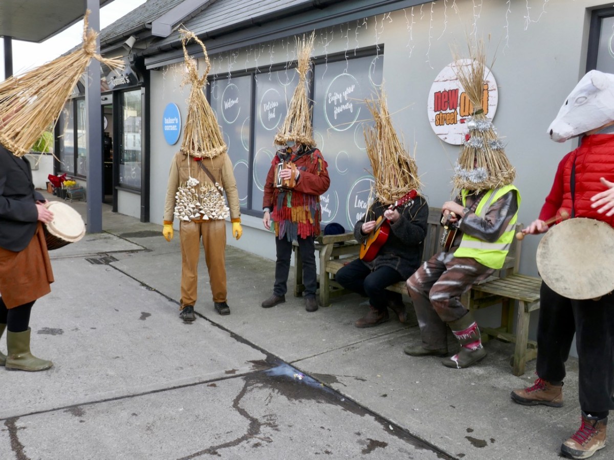 New Years’ Day was quiet day in the village – until we took to the streets! If you want to know the purpose of it all, I can’t really tell you. These are activities that happen around the natural turning point of the year – the change from the sun getting progressively lower in the sky, and weaker, to its returning strength: already we can sense the lengthening of each day. In the mumming on these islands you got a sense of it from a symbolic play where combatants fought and died, then were brought back to life by The Doctor who can apparently cure all illnesses. And, of course, we are always anxious to see the solstice in action!